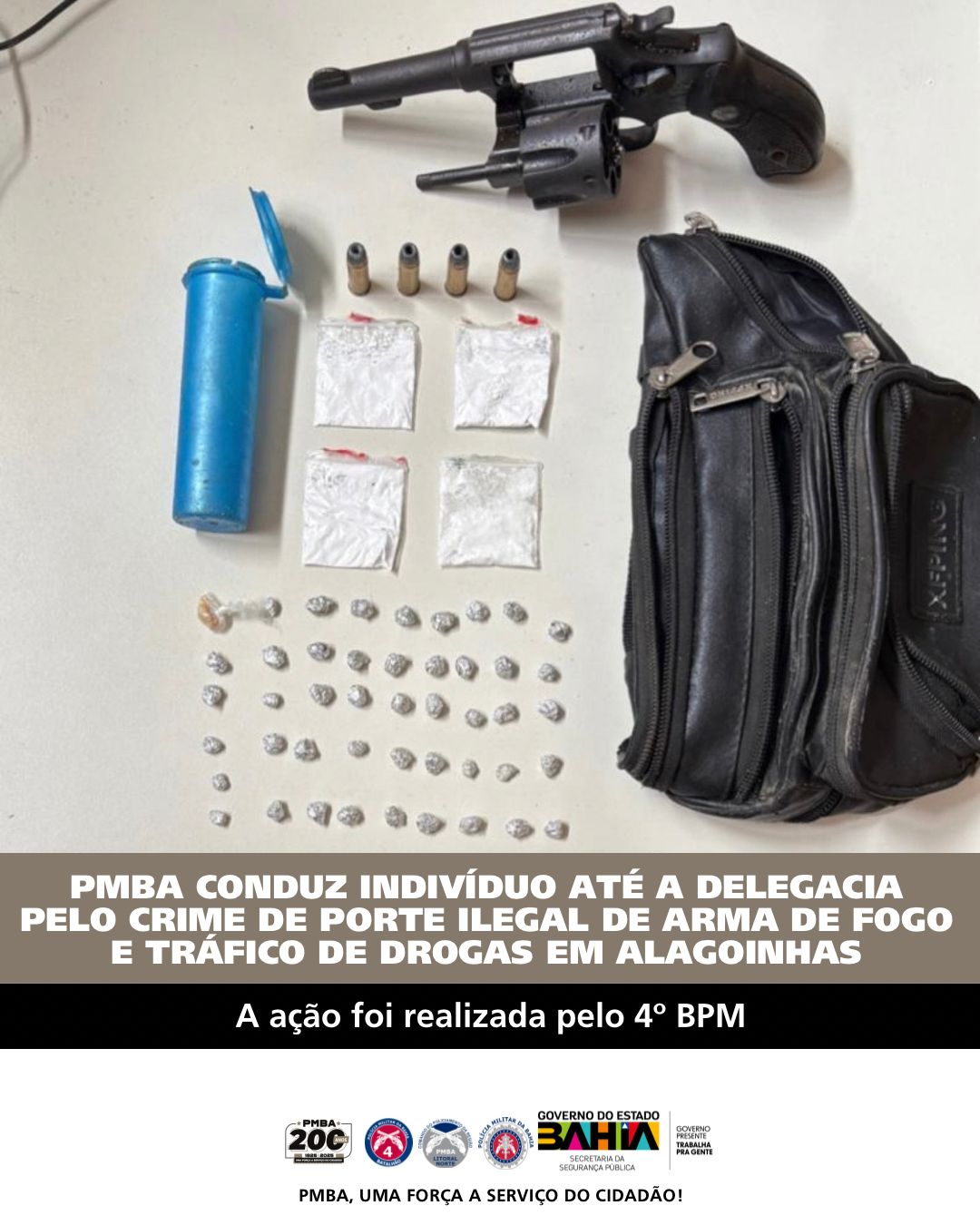 Na manhã de domingo (05), Policiais Militares do 4º BPM apreenderam uma arma de fogo e diversos materiais provenientes do tráfico de drogas na localidade conhecida como Cruzeiro dos Montes, cidade de Alagoinhas. Um indivíduo foi conduzido até a delegacia local pelo crime de porte ilegal de arma de fogo e tráfico de drogas. Os materiais, abaixo relacionados também foram encaminhados a 1ª DT: