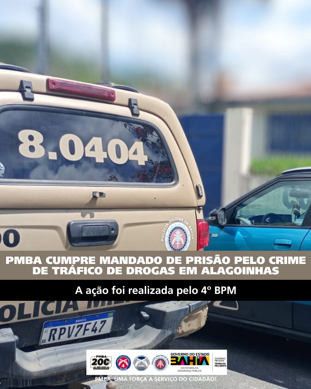 Na tarde de sexta-feira (03), Policiais Militares do 4º BPM, durante a execução de Operação de Trânsito, cumpriram mandato de prisão de um indivíduo pelo crime de tráfico de drogas, a ação ocorreu no bairro Santa Teresinha, cidade de Alagoinhas. O mesmo foi apresentado na Delegacia de Polícia Civil local.