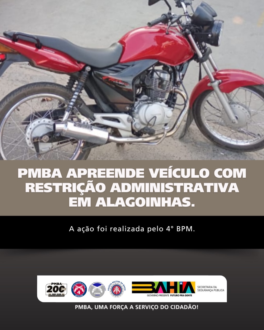 Policiais militares do 4º BPM apreenderam uma motocicleta Honda/CG 150 Fan ESI, de cor vermelha, no bairro Santa Terezinha, em Alagoinhas.