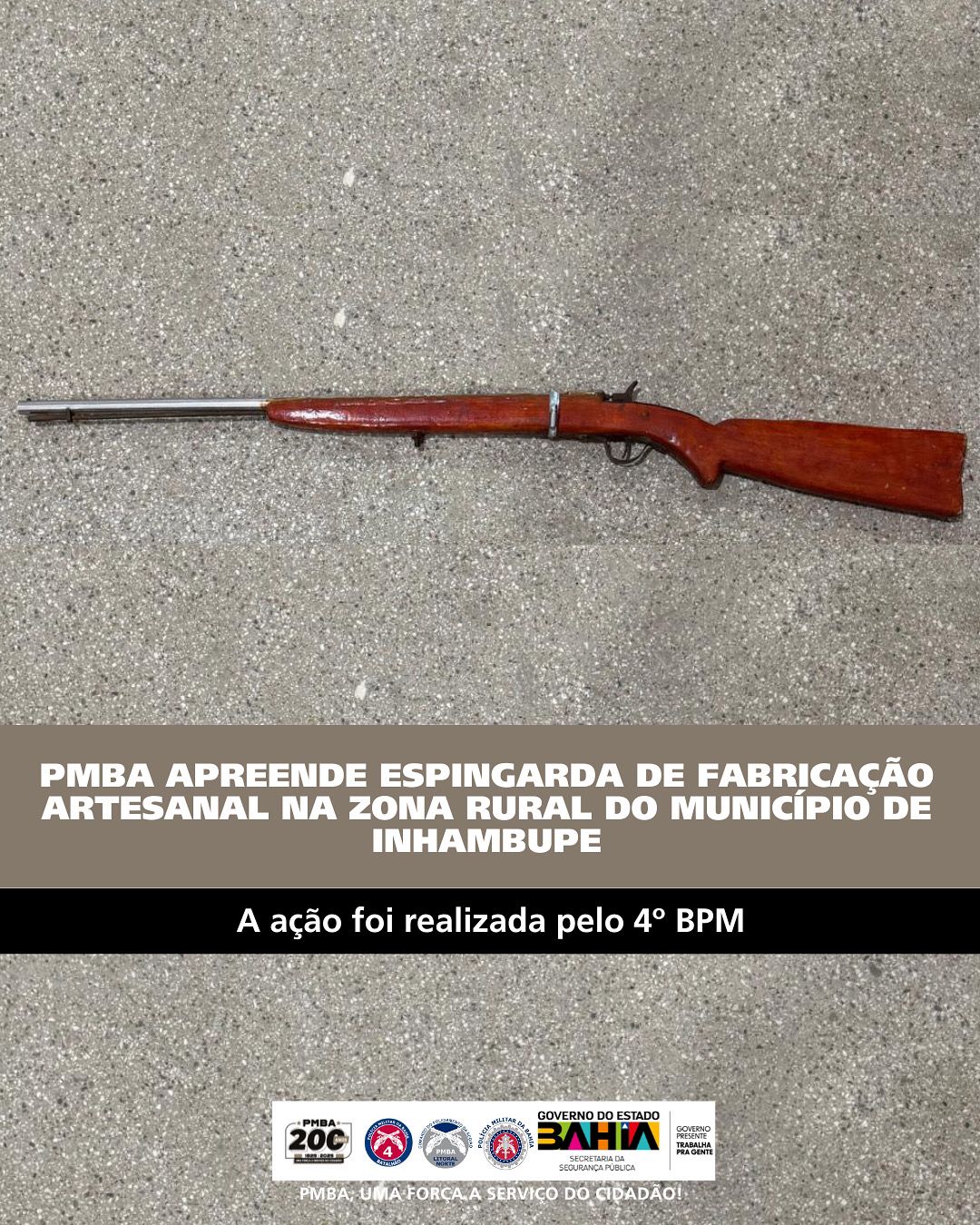 Na noite de domingo (19), Policiais Militares do 4º BPM apreenderam uma espingarda de fabricação artesanal, o objeto foi localizado no povoado de Botelho, zona rural do município de Inhambupe. A ação ocorreu no desdobramento de uma ocorrência de violência doméstica. O armamento foi apresentado na Delegacia da cidade de Inhambupe, o autor conseguiu evadir.