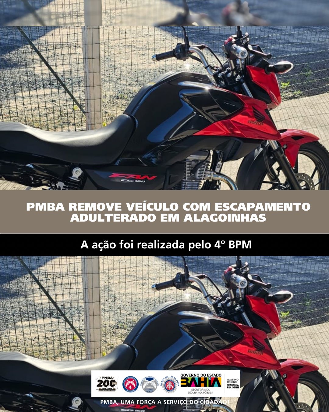 Na tarde de sábado (15), Policiais Militares do 4º BPM realizaram a remoção de uma motocicleta Honda FAN que estava com escapamento adulterado em descumprimento ao CTB e ao Art. 42 da Lei das Contravenções Penais que tipifica a contravenção penal de perturbação do trabalho ou do sossego alheios.