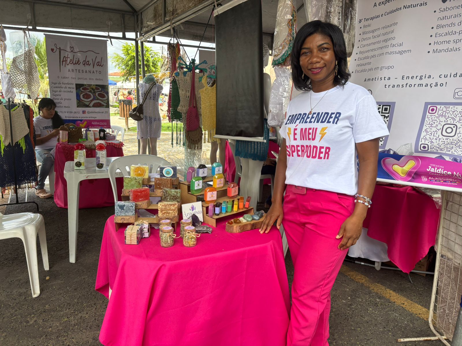 Julieta de Souza trouxe sabonetes artesanais e escalda-pés, produzidos por ela mesma sob a marca Ametista. “É muito gratificante ver que tem pessoas que nos apoiam, nos incentivam, nos dão essa oportunidade de expor, de apresentar nossos produtos para outras pessoas,” disse Julieta, que já participou de outras edições. A produtora destacou que seu trabalho é focado na energia e em cristais, com produtos para prosperidade, boas vibrações e alinhamento de chakras.