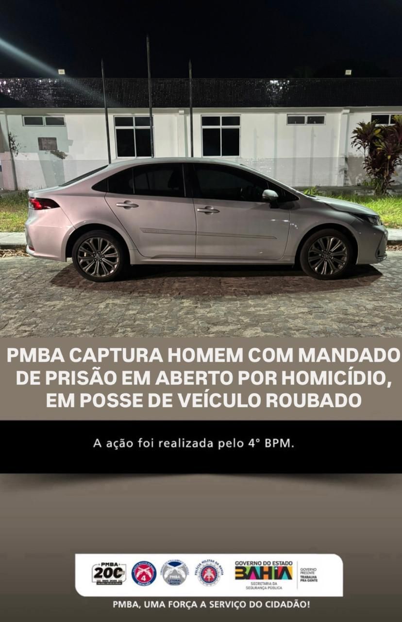 Na madrugada de sábado (20), Policiais Militares do 4º BPM cumpriram mandado de prisão que estava em aberto de indivíduo pela prática do crime de Homicídio, a ação ocorreu no Parque São Bernardo, nas proximidades da Br 101, em Alagoinhas. O mesmo estava em posse de um veículo da marca Toyotta, modelo Corolla, na cor prata, com restrição de furto/roubo e de um papelote contendo substância análoga à maconha.