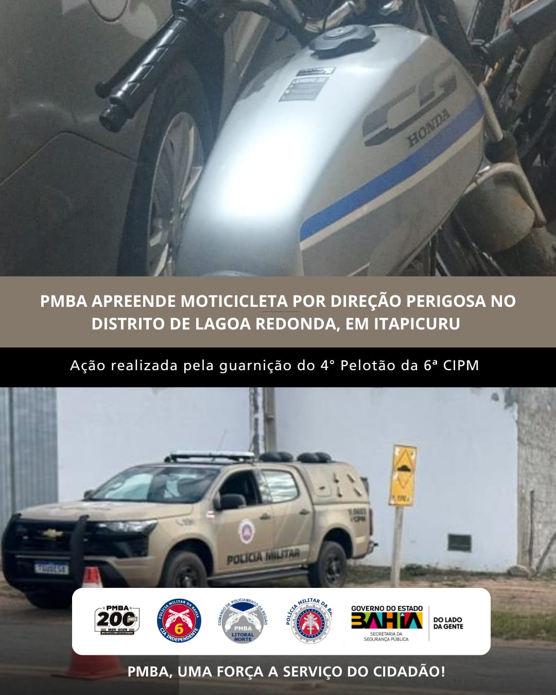 Na manhã desta segunda-feira, 26, no distrito de Lago Redonda, em Itapicuru, a guarnição do 4° Pelotão/ 6ª CIPM apreendeu uma motocicleta por direção perigosa.