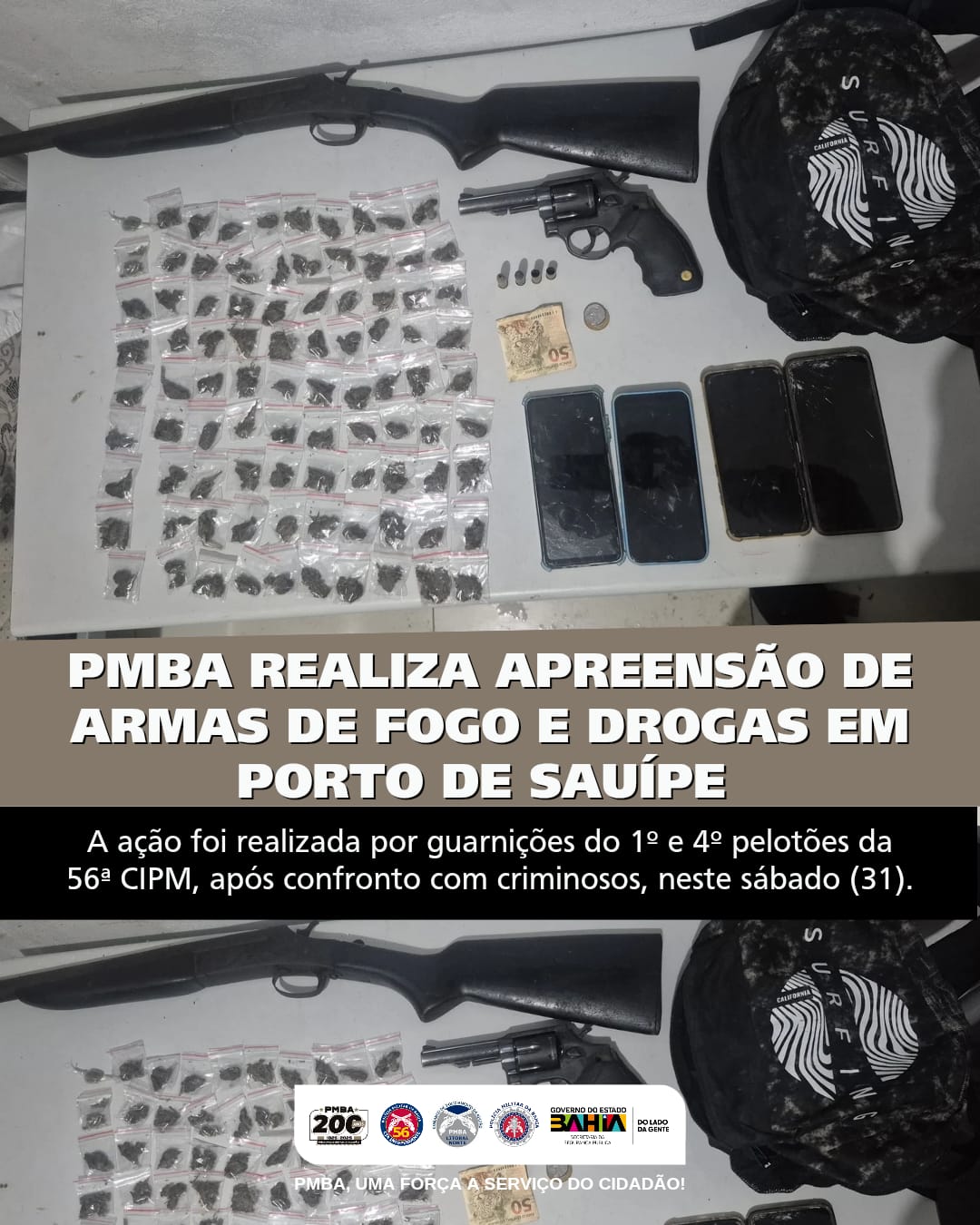 A Polícia Militar da Bahia, por meio de guarnições do 1º e 4º pelotões da 56ª CIPM, realizou a apreensão de armas de fogo e drogas no distrito de Porto de Sauípe, neste sábado (31).