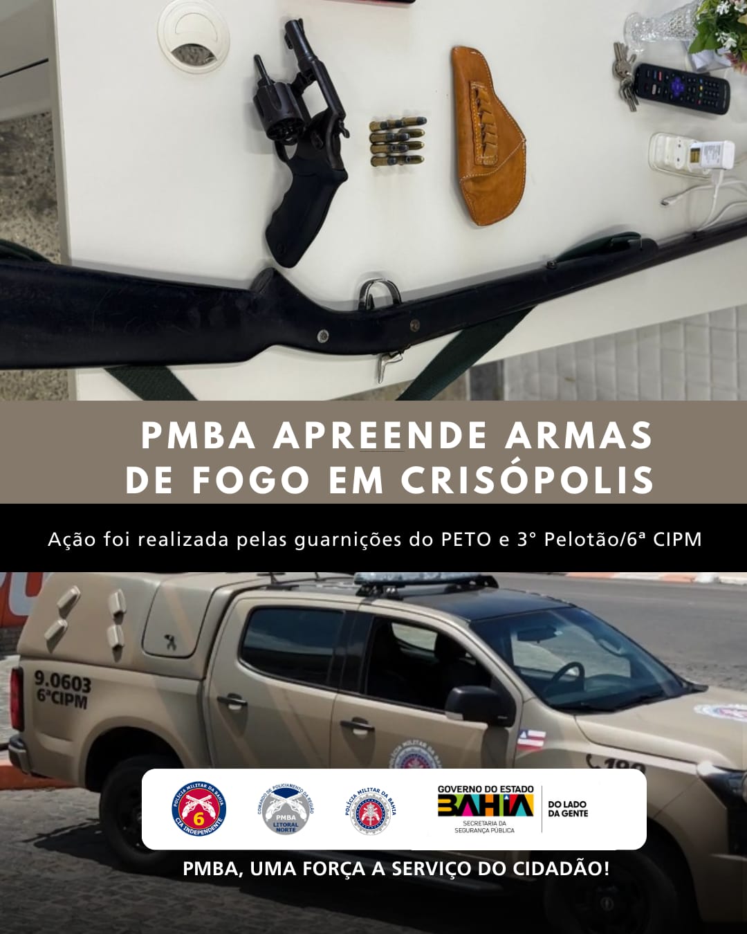 Na diligência, um suspeito, ao notar a presença das viaturas, tentou evadir-se para o interior de uma residência, mas foi alcançado e abordado pelos policiais. Durante a busca pessoal, foi encontrado com o indivíduo, um revólver calibre .38 e 12 munições. Em ato contínuo, uma segunda arma de fabricação artesanal foi também apreendida.