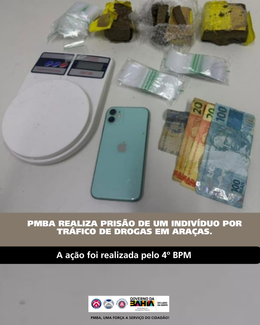 Durante rondas ostensivas em Araçás, policiais militares do 4º BPM localizaram um indivíduo denunciado por tráfico de drogas.
