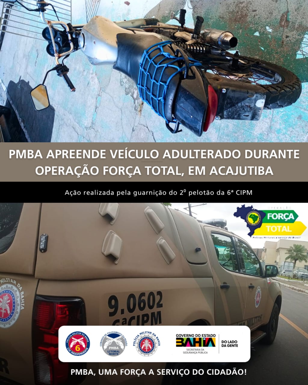 Na tarde desta quinta-feira (26), em Acajutiba, a guarnição do 2º Pelotão da 6ª CIPM apreendeu uma motocicleta com sinais de irregularidade e conduziu dois homens à delegacia após abordagem na região central.