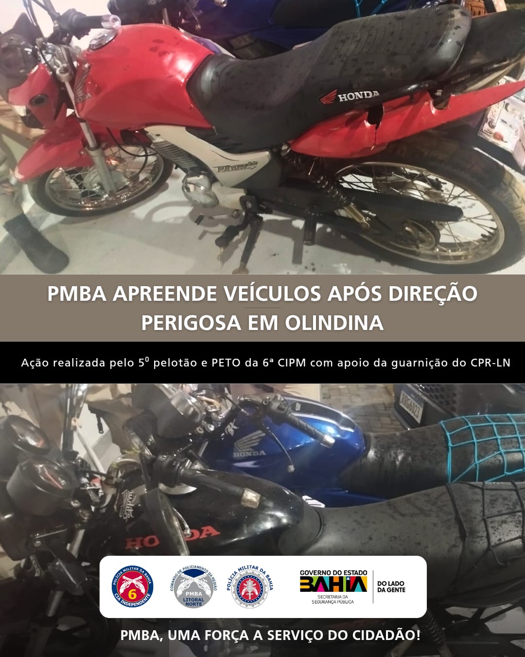 Na tarde desta terça-feira (25), a guarnição do 5º Pelotão da 6ª CIPM foi acionada após denúncia de indivíduos realizando manobras perigosas com motocicletas no povoado Canabrava, zona rural de Olindina.