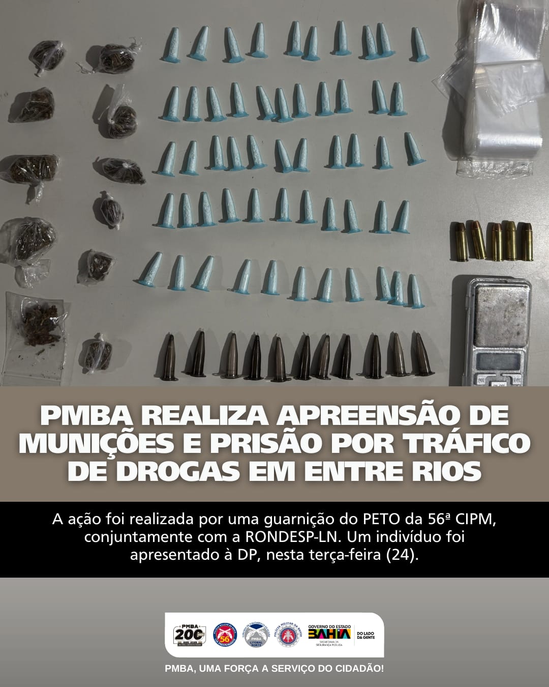 Na tarde desta terça-feira(24), a PMBA, por meio de uma guarnição do PETO da 56ª CIPM, em ação conjunta com a RONDESP-LN, realizou a prisão de um indivíduo por tráfico de drogas no município de Entre Rios.
