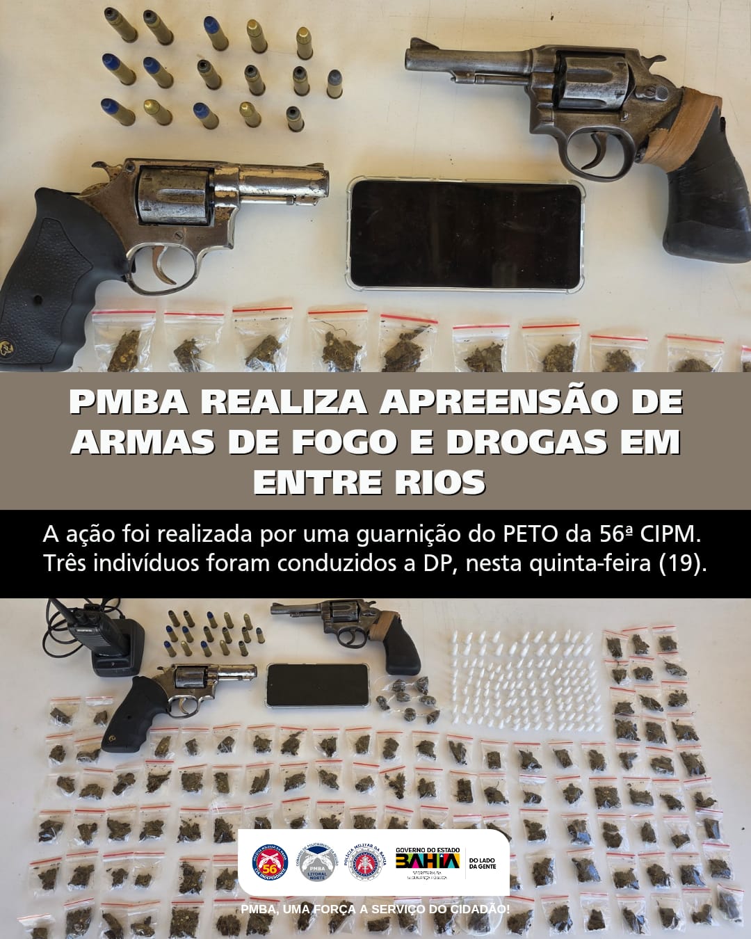Nesta quinta-feira (19), a Polícia Militar da Bahia, por meio de uma guarnição do PETO da 56ª CIPM, realizou a apreensão de armas de fogo e drogas no bairro Bela Vista, no município de Entre Rios.